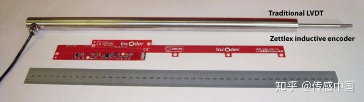 传统LVDT(顶部)和Zettlex线性传感器(中间)的图像。以下规模。